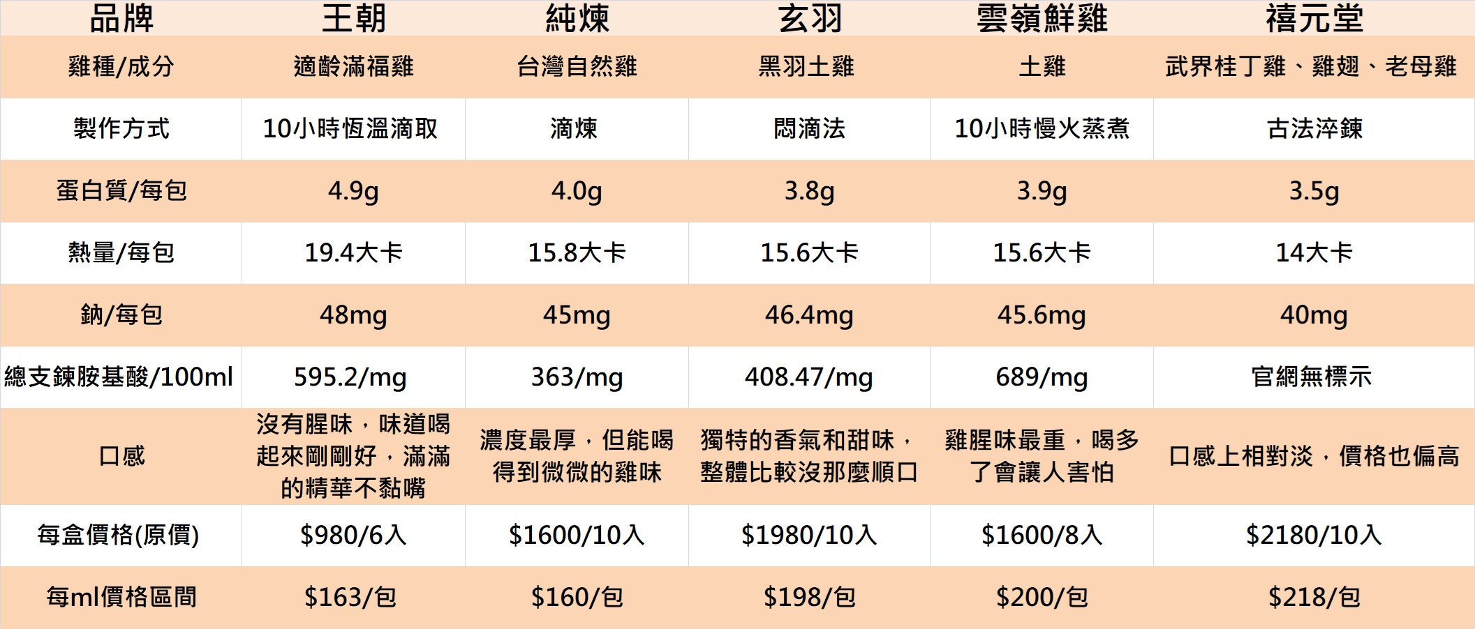 整體喝下來我最喜歡王朝常溫原味滴雞精,不管是適口性,還是蛋白質都是很符合我的需求,價位也偏中等,很適合平常保養的首選,這裡也簡單整理五款評比的表格給你們,希望有幫助到。